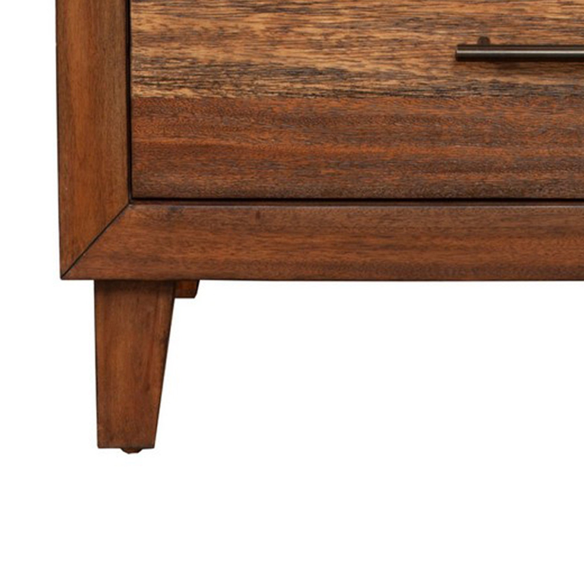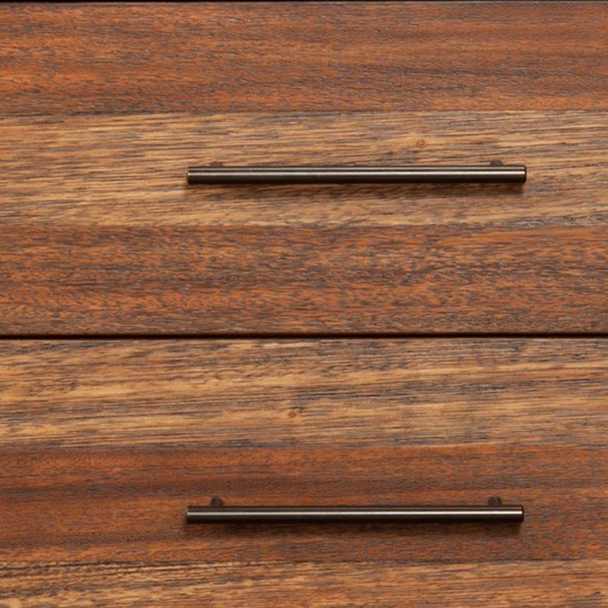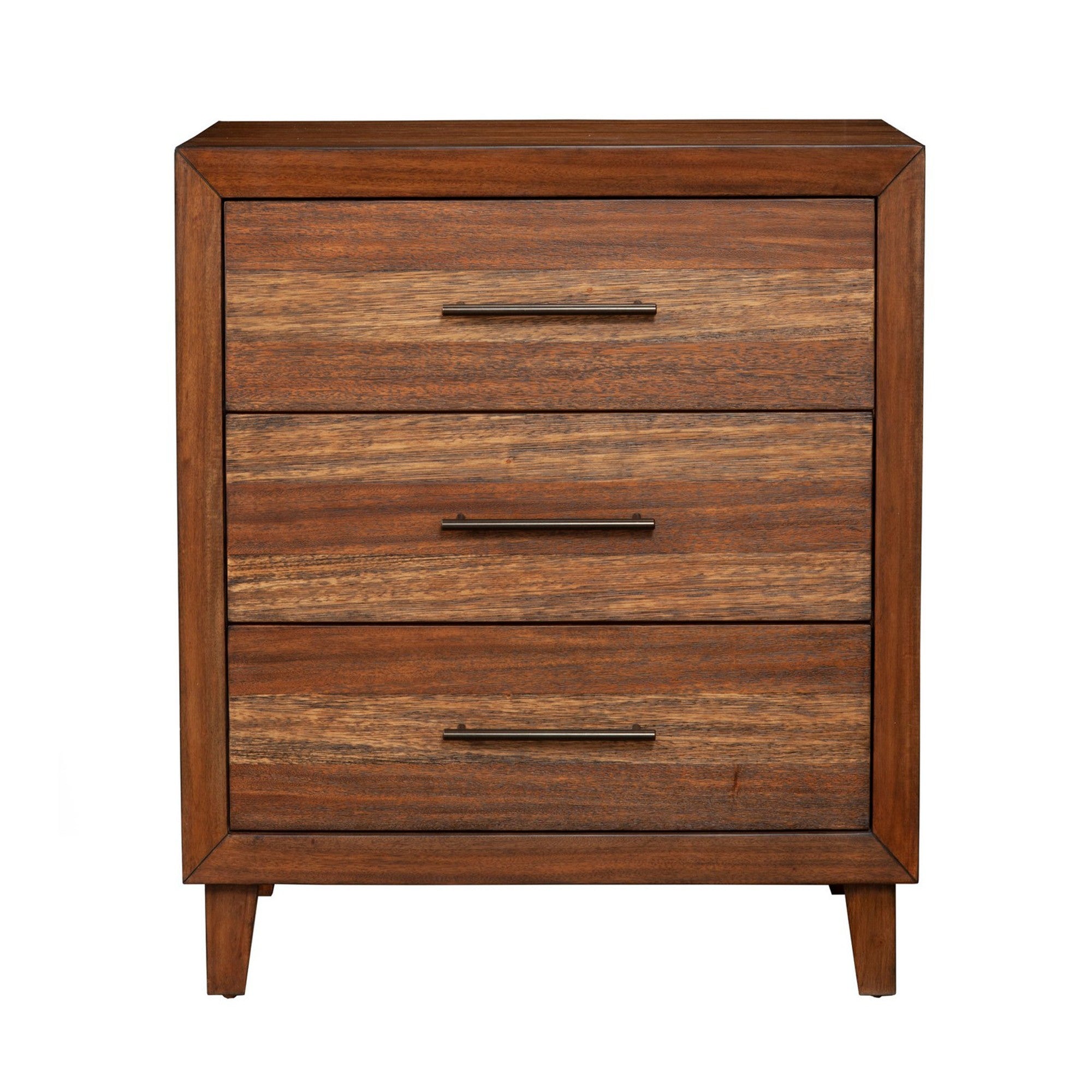 Impart a natural flair to your bedroom decor with this gorgeous dresser chest. Featuring three smooth gliding drawers for keeping clothes and linens organized, it is crafted from mahogany wood and veneer in warm brown finish. Accented with dark bronze metal handles, it is supported on block legs for strong, industrially inspired strength and style. Check out our Paul collection for more options.