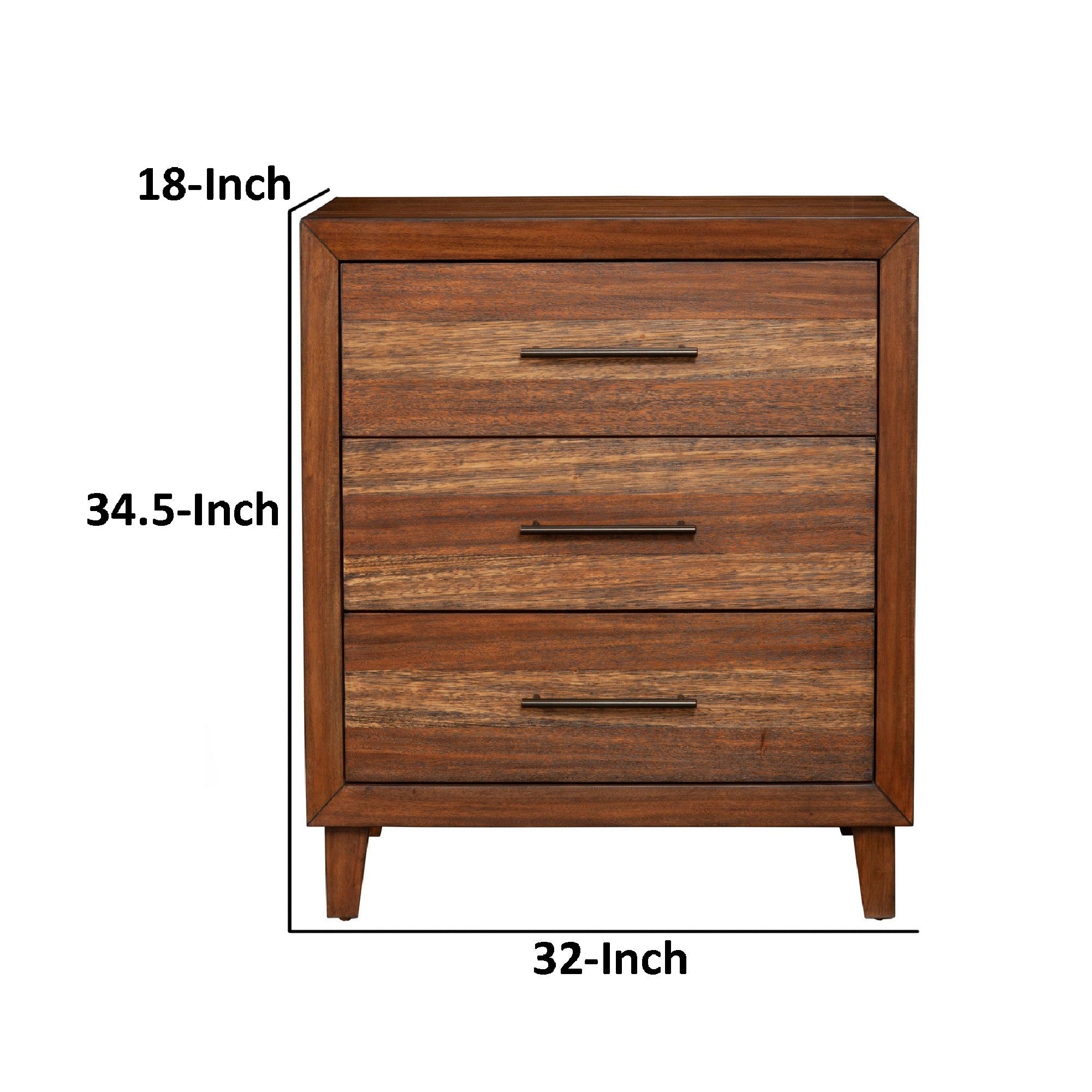 Paul 35 Inch Small Dresser Chest 3 Drawers Metal Bar Handles Warm Brown BM284272 - Benzara
