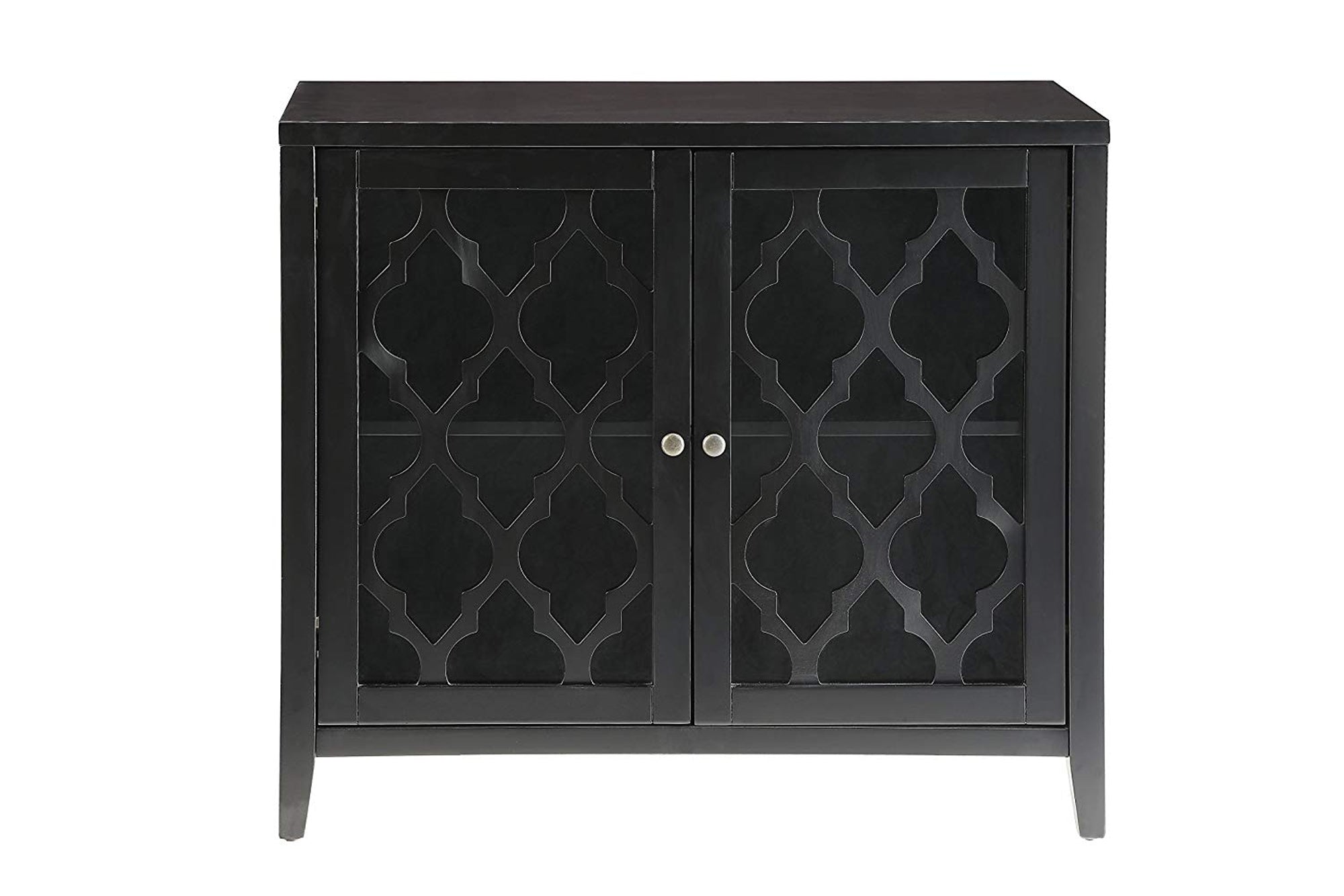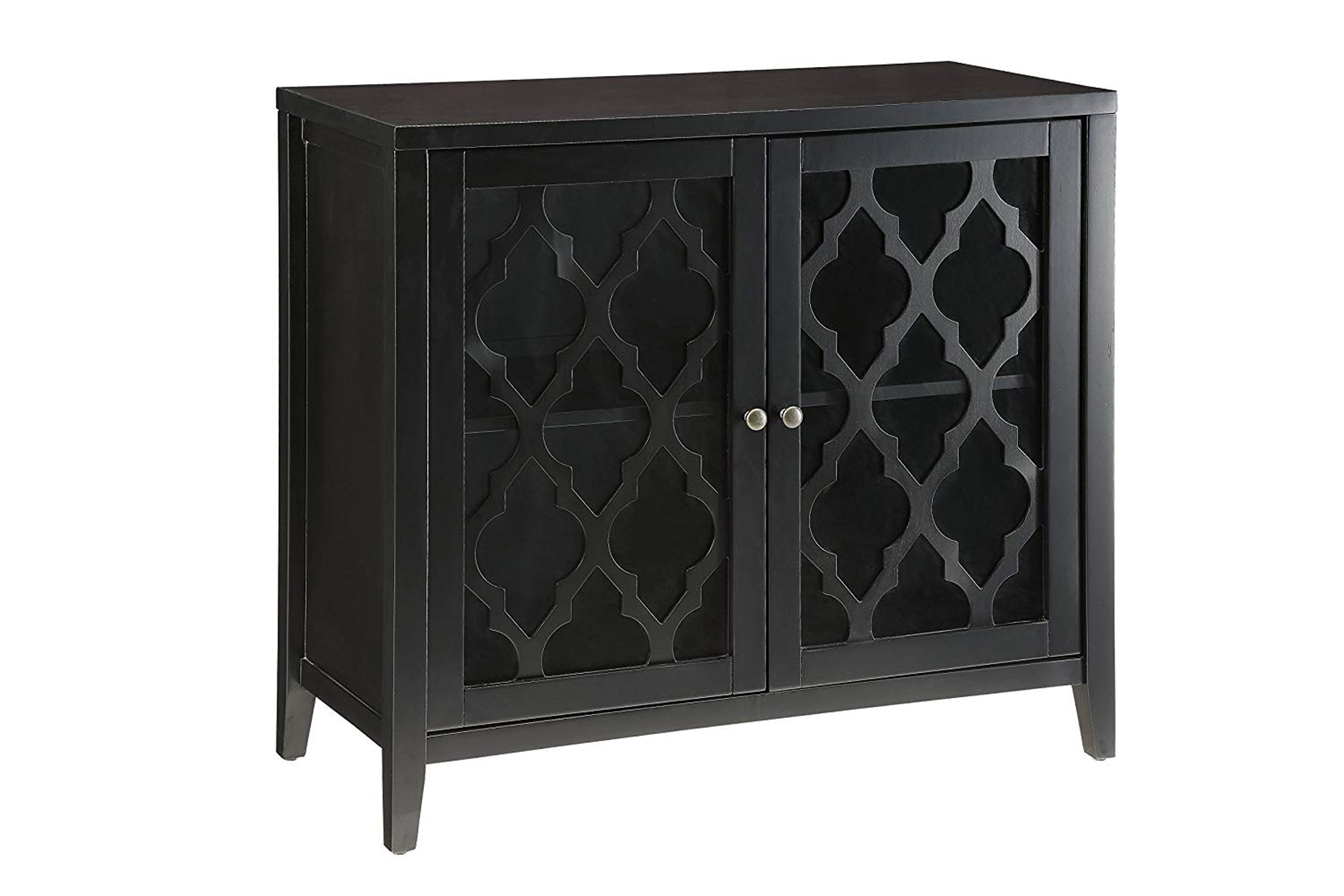 A perfect blend of style and sophistication, this Storage Cabinet is all you need to accentuate the aesthetics of your interior. Incorporated with 2 soft closing doors, it showcases quatrefoil design all over the door panels. Constructed from a combination of wood and glass panels, it is accented with a black finish.