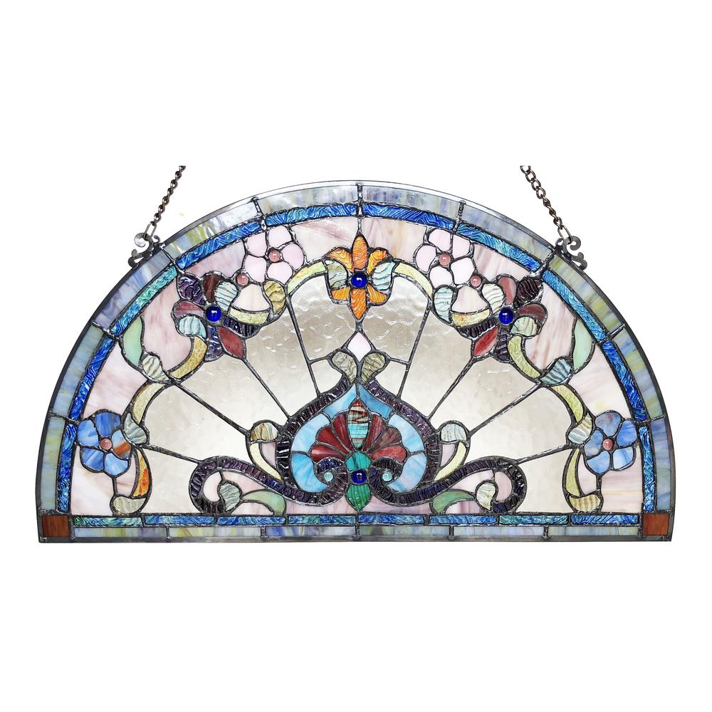 EMERSYN, a Victorian style stained glass window panel features a beautiful hand crafted design that will brighten up any room with it's unique beauty. Hand crafted from over 210 pieces of art glass and 12 glass beads. Main colors are peach and bue. Handcrafted using the same techniques that were developed by Louis Comfort Tiffany in the early 1900s, this beautiful Tiffany-style piece contains hand-cut pieces of stained glass, each wrapped in fine copper foil. Product Specs: Product Height: