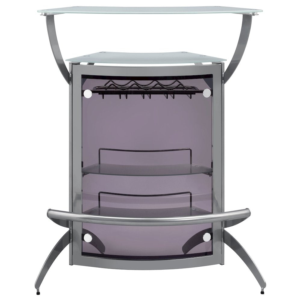 From fancy dinner parties to laid-back barbecues, this magnificent metal bar unit is the perfect upgrade to any room where guests may gather. Its versatile design provides a variety of convenient options for your entertaining needs. The contemporary curves of its metal frame add a sleek, sophisticated aesthetic, while transparent smoked acrylic panels put your glassware collection on proud display. A frosted, tempered glass top finishes off its bold, modern look. Featuring a handy metal rack for stemware and multiple shelves, this unit easily accommodates a wide variety of bar accessories.