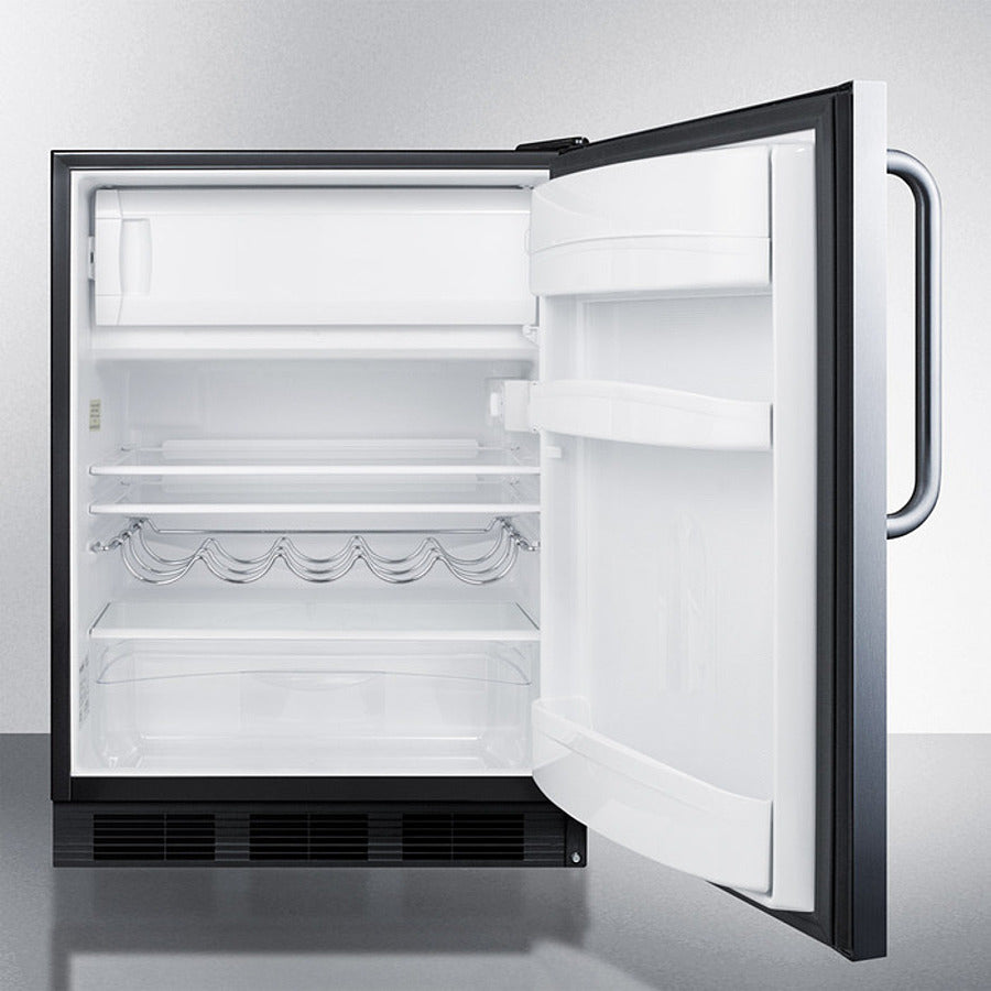 SUMMIT brings quality and value under the counter with the industry’s largest collection of built-in refrigeration. The CT663BBI Series features residential refrigerator-freezers made in Europe and designed for reliable cold storage in any home kitchen.Sized with a 24” footprint, CT663BKBISSTB refrigerator-freezer offers a generous 5.1 cu.ft. storage capacity, a larger interior than many units in this size class. The front-breathing design allows built-in installation under counters, while the fully finished cabinet also enables freestanding use. This unit comes with a black cabinet and stainless steel wrapped door. A curved towel bar style handle in brushed stainless steel completes the professional look.Inside, the CT663BKBISSTB features a dual evaporator to allow separated cooling of the fresh and frozen food sections. The refrigerated compartment utilizes low maintenance automatic defrost, while the interior freezer compartment is manual defrost to achieve lower storage temperatures ideal for ice cream and other frozen food. The deluxe interior includes adjustable glass shelves for spill-proof storage and easier cleaning, as well as a scalloped wine shelf to hold wine and champagne bottles safely in place. Door racks offer additional convenience for tall bottles and condiments and a clear crisper drawer ensures your produce is stored under the ideal conditions. This model includes automatic interior lighting and an adjustable dial thermostat.With its ideal dimensions and user-friendly features, the CT663BKBISSTB is the perfect refrigerator-freezer for any home in need of versatile storage under the counter.