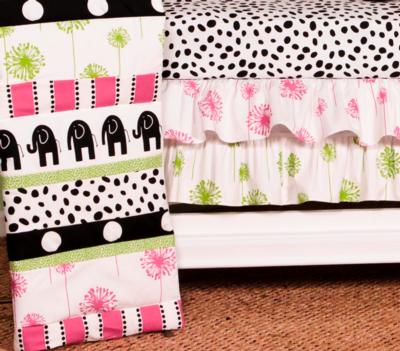 A quality baby bedding set is essential in making your nursery warm and inviting. All patterns are made using the finest quality materials and are uniquely designed to create an elegant and sophisticated nursery. The Hottsie Dottsie 3 pc set includes dust ruffle, fitted crib sheet, and coverlet. This collection is 100% cotton. Graphic, fun, contemporary. Black elephants with hot pink and green accents. The channel quilted comforter in 6 fun fabrics, sheet in white with black spots. The dust ruffle is double shirred in pink and green floral. makes a smashing nursery. Wash gentle cycle, separate, cold water. Tumble dry low or hang dry. Fun crib bedding for your special girl. NO BUMPER INCLUDED IN THIS SET.