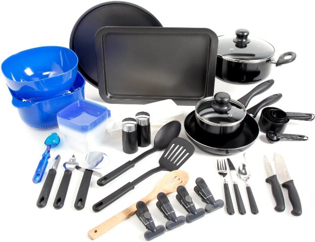 Home Total Kitchen 59 PC Cookware Combo Set - 1qt Covered Sauce Pan, 4qt Covered Dutch Oven, 8.65in Fry Pan, 13in Cokkie Sheet, 12in Pizza Pan, Solid Spoon, Slotted Spatula, 4pc of each Dinner Spoon, Dinner Fork, Dinner Knife, Mixing Bowl, Salt and Pepper, Bag Clip, 10 Covered Storage Set, 1pc of each Bamboo Tool, Pizza Cutter, Peeler, Bottle Opener, 2pc of Ice Cube Tray, Ice Cream Scoop, 10pc Measuring Spoon and Cups, Colander, 5in Santoku Knife, 3in Paring Knife, Cutting Board