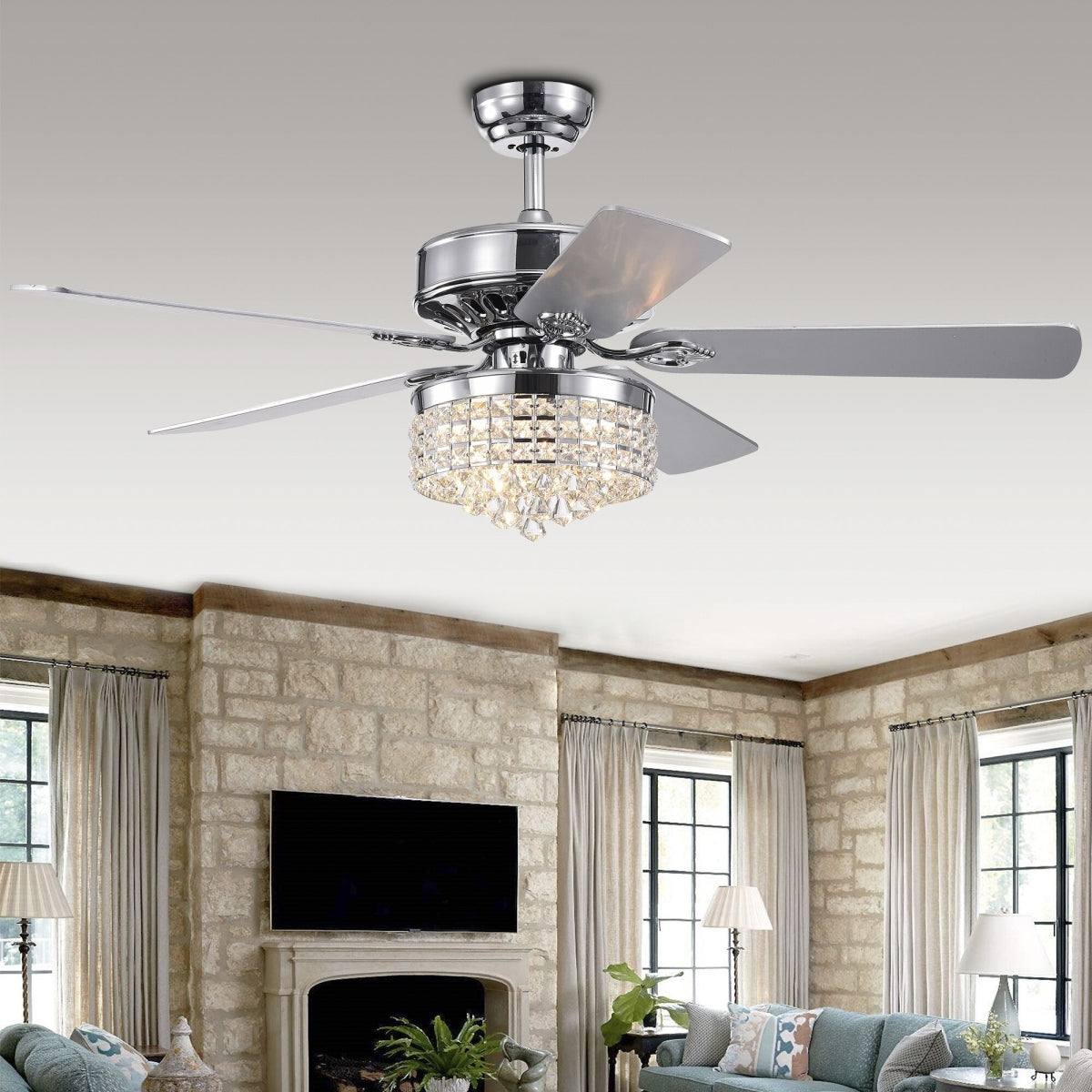Bring together a space that is perfect for receiving and entertaining guests with the Letta lighted ceiling fan from Warehouse of Tiffany. Giving off an elegant allure, this timeless is quite a scene-stealer with its crystal-accented drum-shaped shade and the blades' embossed ornamental pattern. The fixture's silvertone chrome finish gives off a dash of modern charm.