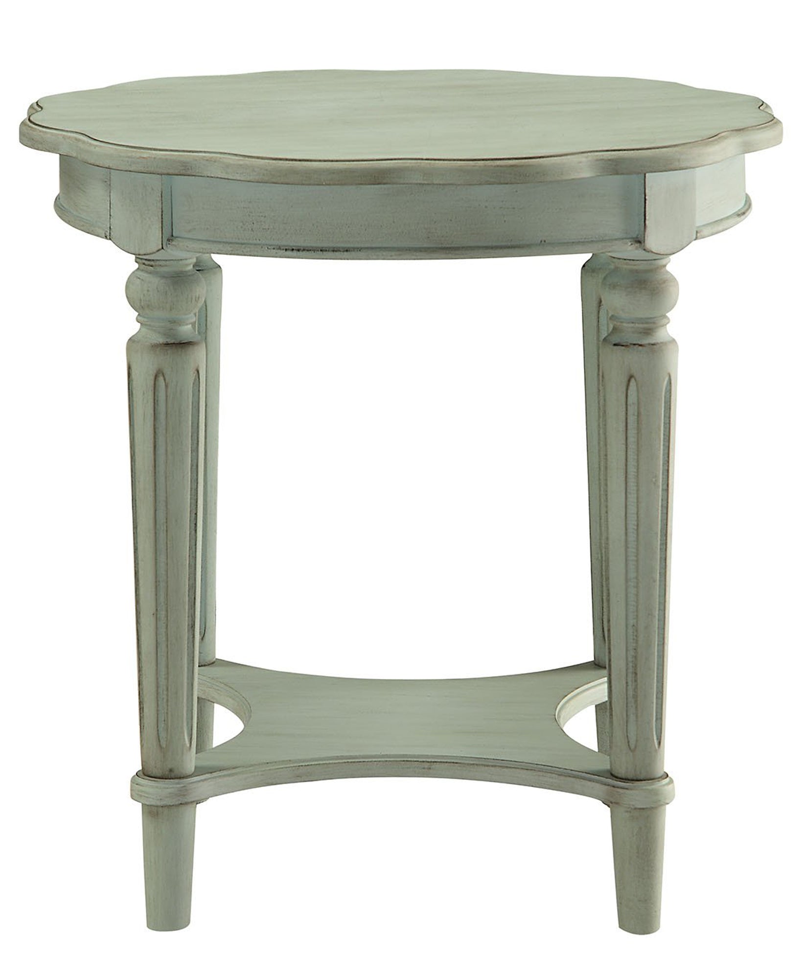 The French country-inspired Fordon occasional table is gracefully designed and made from quality materials. Scalloped round table top, turned legs and a bottom shelf, each piece is carefully crafted while superb functionality is kept in mind. This occasional collection is available in both of coffee and end table, in antiqued green color.