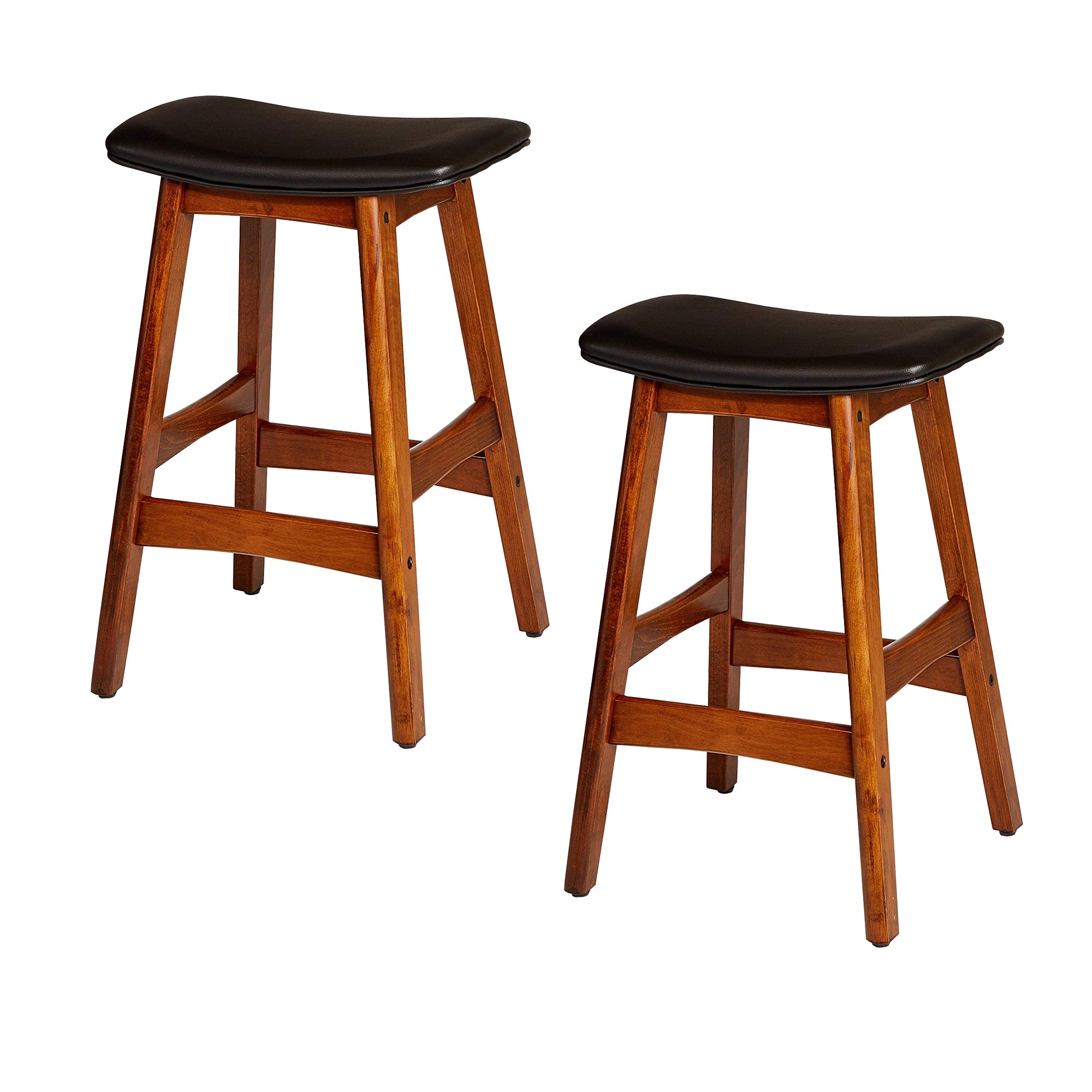 Outfit the home bar or accent your favorite seating group with this essential counter height stool, perfect in the parlor or den. This set of 2 counter height stools and its contemporary style will be a welcome addition to your home. It is constructed of wood, which provides good sturdy performance. It features a saddle seat design with a leather upholstered scooped seat and footrest for extra comfort. This stool fits into any home setting. It is a great addition to your kitchen, breakfast nook, and bar area. Measurement is 17 X 10.75 X 25.25H.