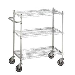 These bright shiny chrome all purpose 42 high carts are as flexible as they are practical and are equipped with three sturdy 18 x 36 wire shelves.