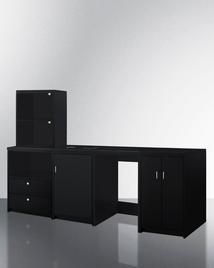 Sleek black laminate finish on the cabinet pieces suits any setting