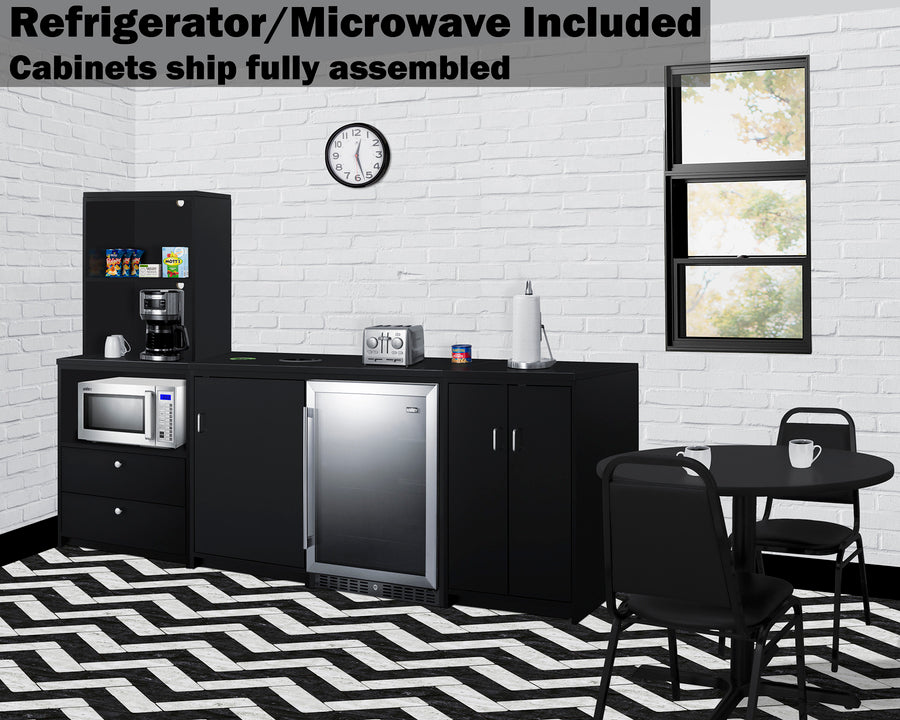 Includes Summit AL54 all-refrigerator, CWR4ADA refrigerator cabinet, SCM1000SS microwave, CWM2ADA and CWC1ADA storage cabinets, CWC5ADA trash cabinet, and CWH2 cabinet hutch