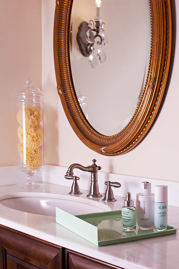 Lower shelf features a variety of cutout sizes for upright storage of serums, creams, and similar cosmetics