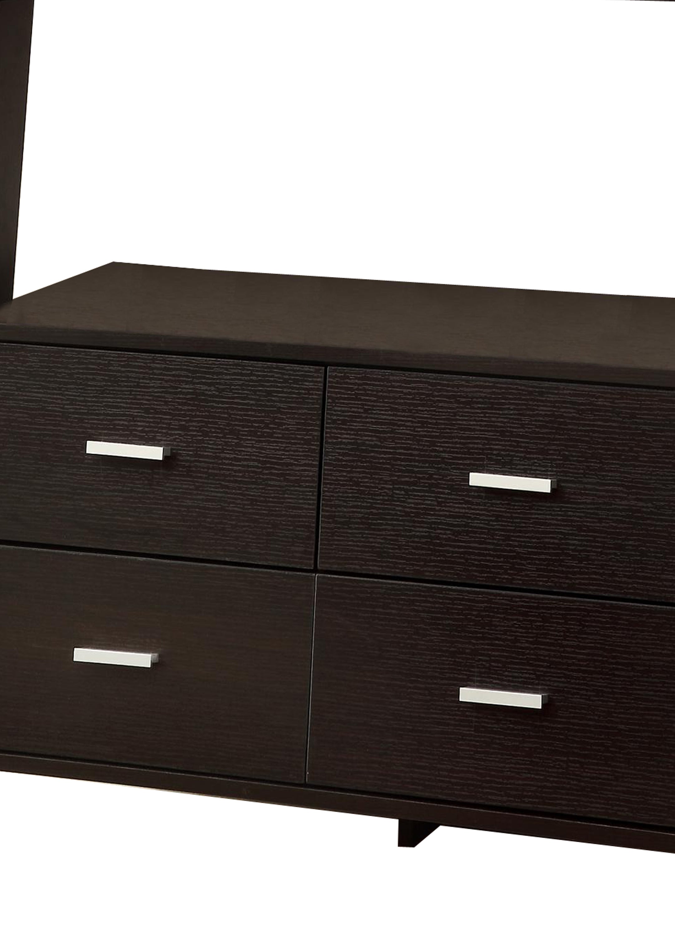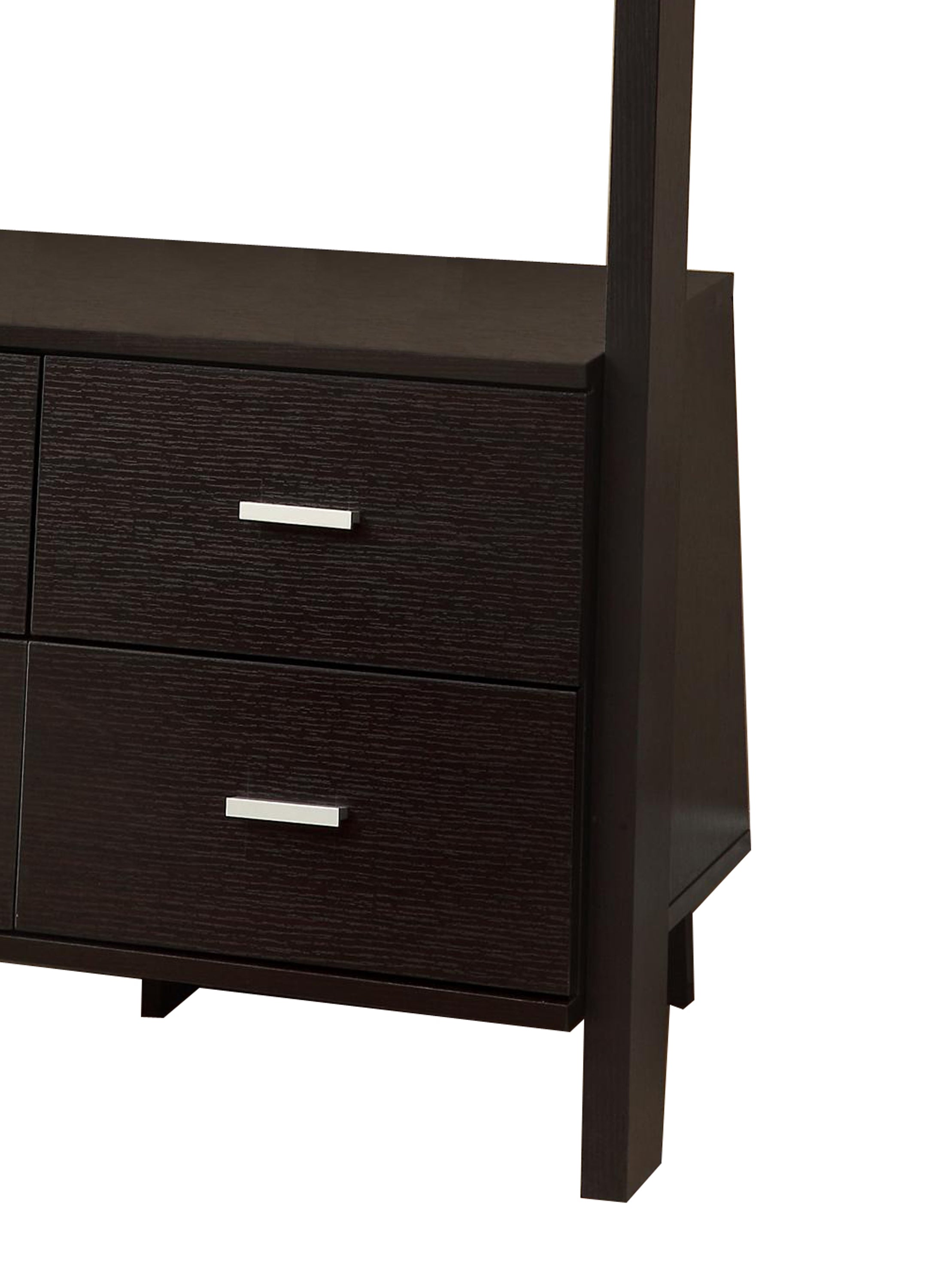 Three graduating open shelves provide ample room to display pictures, decorative pieces, or books with tipping hardware included for further stability when placed against a wall . Four convenient storage drawers accented with sleek silver metal handles adds even more space to put away accessories within easy reach. A contemporary design in a rich cappuccino finish, the exquisite symmetry of this ladder bookcase adds style to a living room, home office, or hallway. It does not include any other featured product other than a Bookcase.