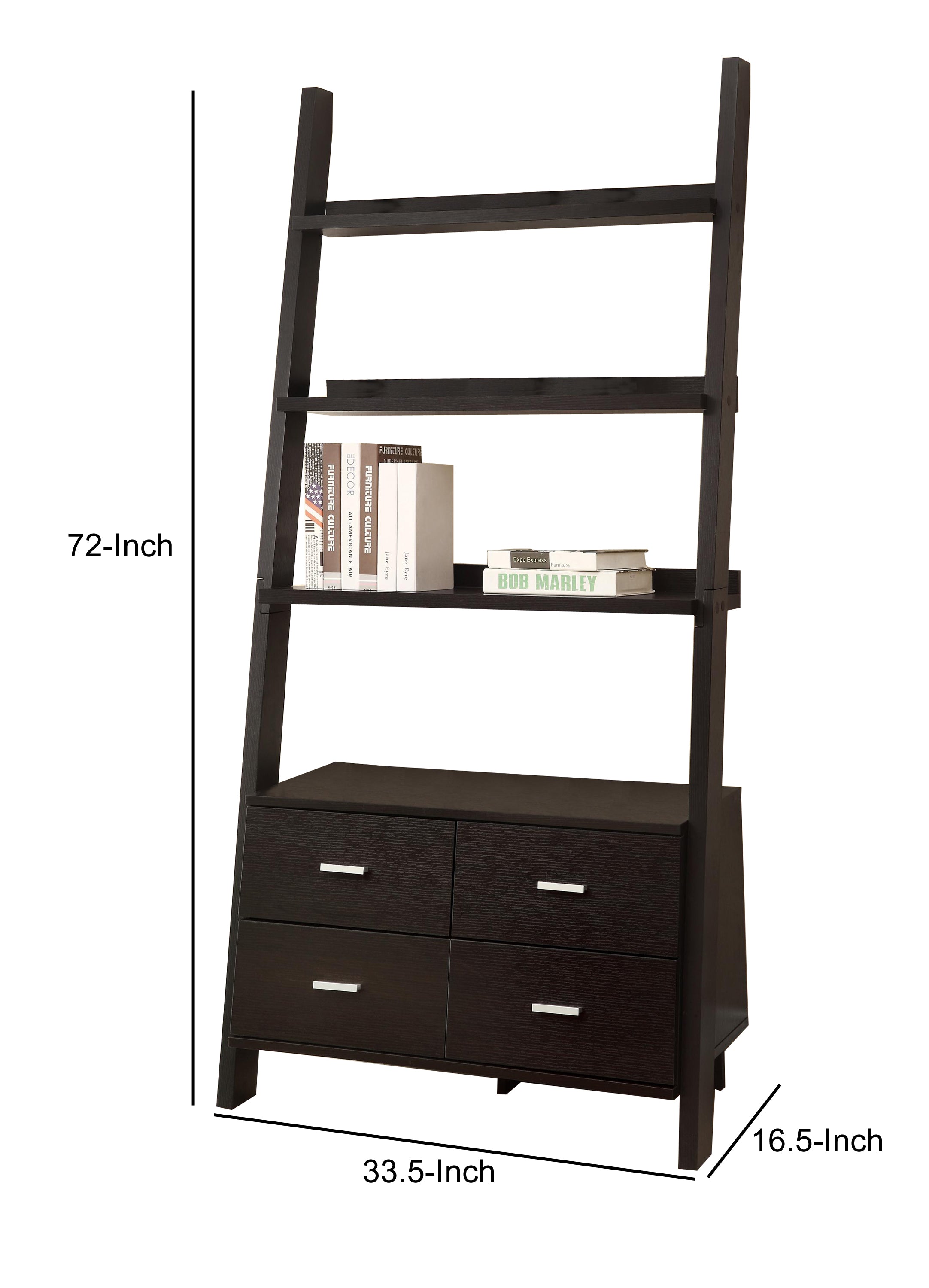 Quirky Ladder Bookcase With 4 Storage Drawers And Open Shelves Cappuccino BM172220 - Benzara