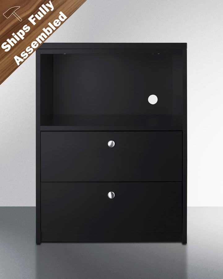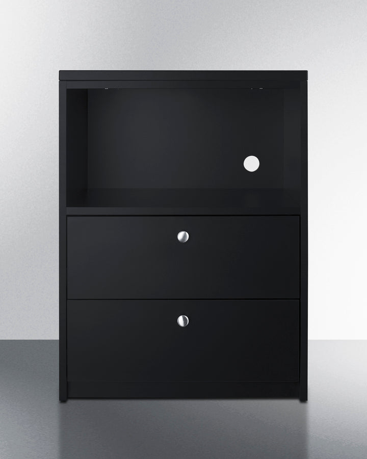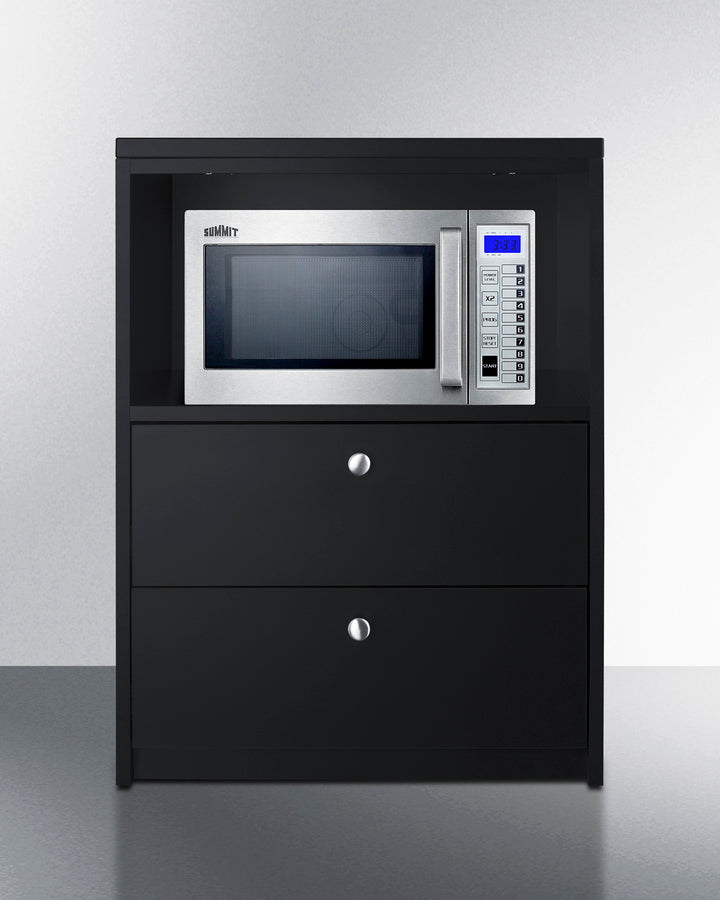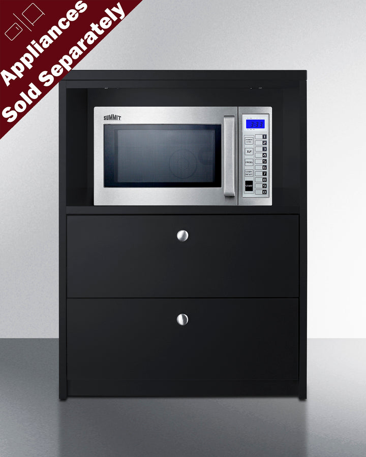 Summit's selection of American-made casework brings new convenience to break room design with fully assembled cabinetry for easy installation. Perfect for break rooms, the CWM2ADA is a 21.5'' wide cabinet in a jet black manufactured wood finish sized at 34'' high to comply with ADA guidelines for accessible counter height. It features a 12.5'' H x 24.5'' wide opening ideal for holding a small appliance, such as a coffeemaker or microwave. A pre-installed hole in the rear makes it easy to loop a power cord through. The lower compartment features two slide-out drawers for easy storage. This unit is manufactured in the United States and ships fully assembled with innovative Lockdowel™ fasteners for long-lasting durability. It can be combined with additional Summit casework pieces, including vertical hutches (model CWH2), trash bins (model CWC5ADA), and cabinets sized to hold refrigerators (models CWR2ADA, CWR4ADA, and CWR9ADA). Popular Summit microwave choices that fit into the CWM2ADA include residential models SM1102WH, SCM853, SM903BSA, and SM902BL, and commercially approved microwave SCM1000SS. Create any combination by browsing our website or contact our product specialists at 718-893-3900 ext. 507 to work through your ideal break room kitchen design.