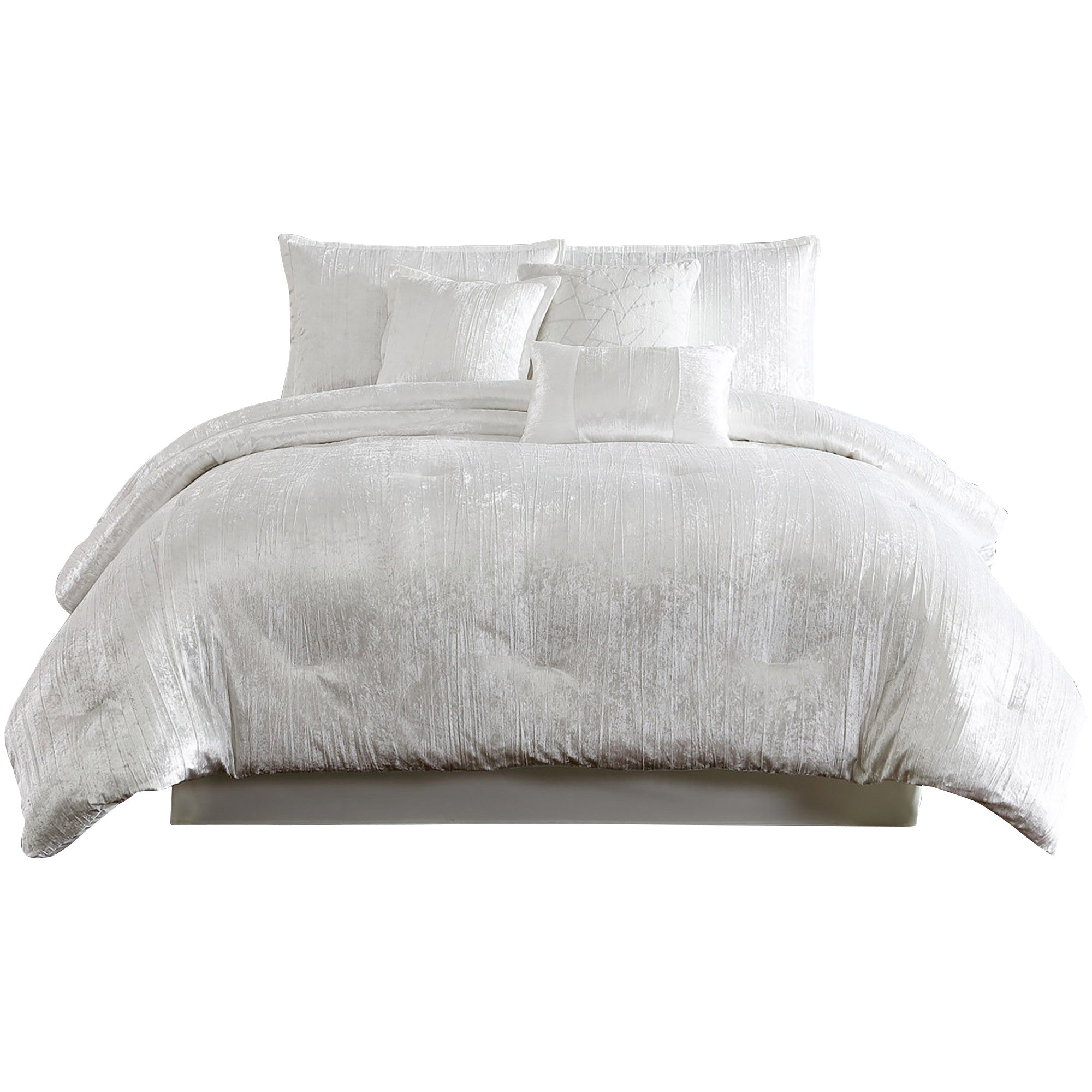 Impart a deluxe look and feel to your master or guest bedroom with this seven piece queen comforter set in white. Featuring an ultra polyester velvet fabric with brushed backing, the crinkle textured front brings this quilted set to life. Generously filled with polyester, the set has an unmatched luxurious flair. Check out our Jay collection for more options in color and size.
