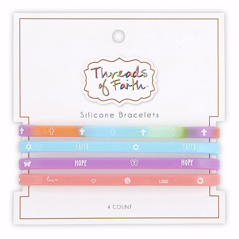 This set of thin silicone stretch bracelets comes with 4 uniquely colored styles. Carded to hang on slat wall or display in a basket.