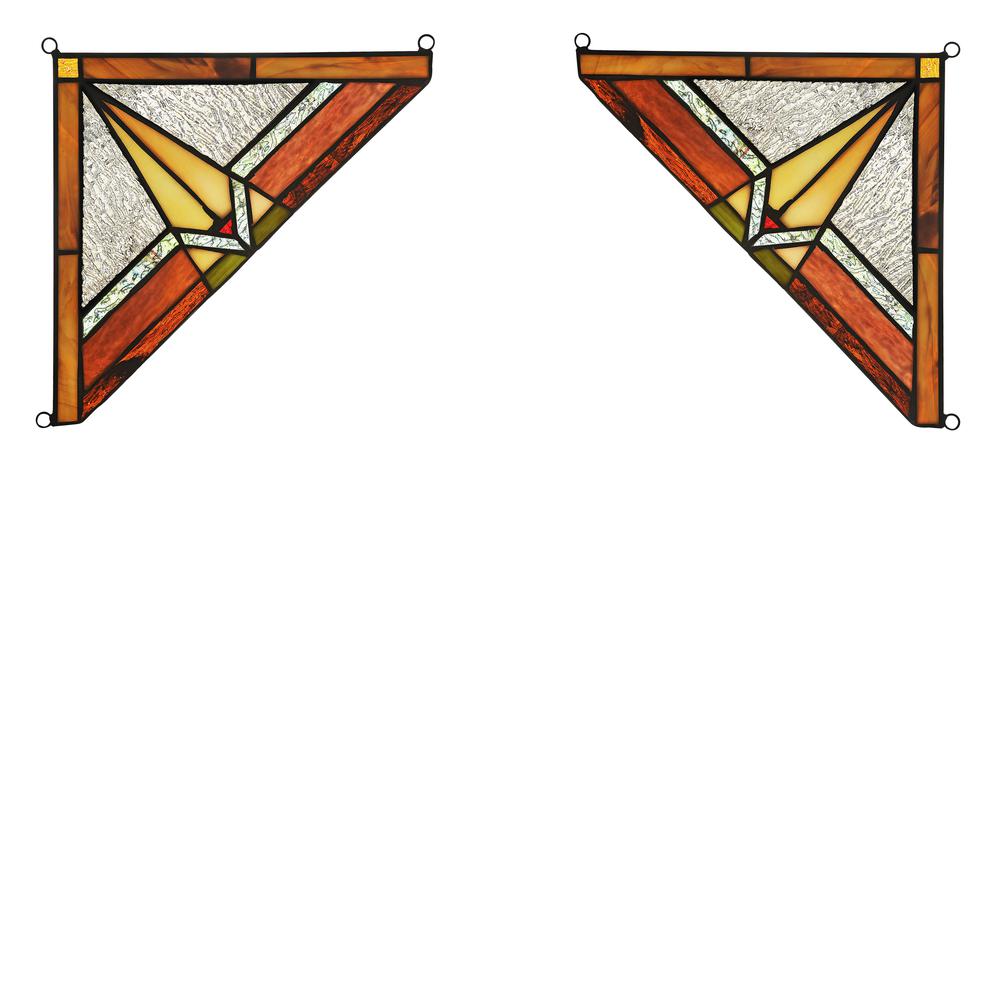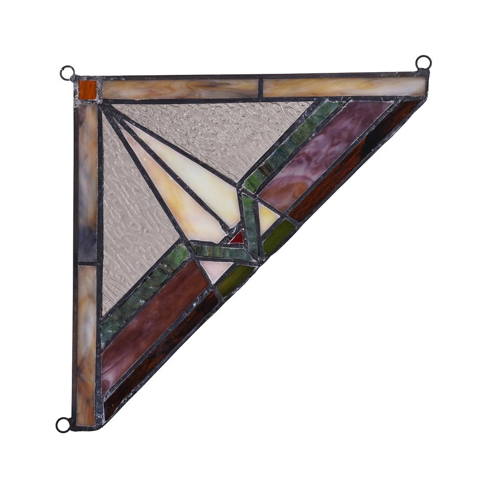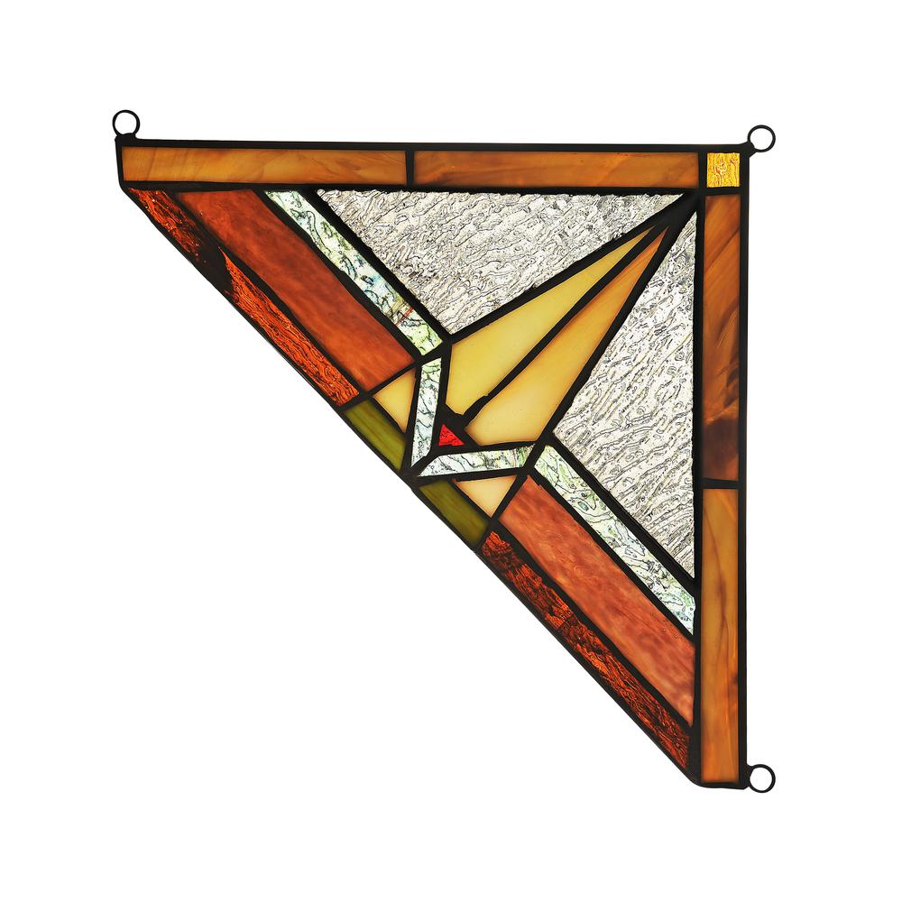 DESMUND, a Mission style stained glass window panel features a timeless look that will compliment your home. Handcrafted from over 20 pieces of art glass. Main color is brown. Handcrafted using the same techniques that were developed by Louis Comfort Tiffany in the early 1900s, this beautiful Tiffany-style piece contains hand-cut pieces of stained glass, each wrapped in fine copper foil. Product Specs: Product Height: