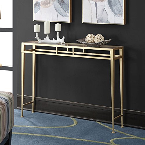 The sleek styling of the Gold Coast Julia Console Table by is sure to grab the attention of your guests. This piece features a clear tempered glass table top for you to display your collectibles or place other belongings. The contemporary iron frame provides plenty of detail and stability with its double apron top tapered straight legs and bun feet. The Julia Console Tableâs simple design will complement any decor and while becoming a staple piece in your home. Available in multiple finishes you can pair the Gold Coast Julia Console Table with other Gold Coast Collection items available from sold separately.