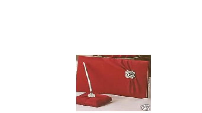 This Beverly Clark red Garbo Guest Book is 10.5 w x 6 inch h. Includes space for 600 signatures and thoughts. Exquisite matte bridal satin softly draped and finished with a romantic rhinestone piece. Each piece is hand made by Beverly Clark Wedding Accessory Collection expertly trained staff in North Chicago.